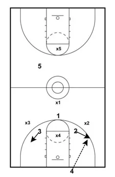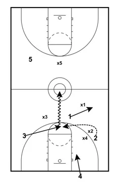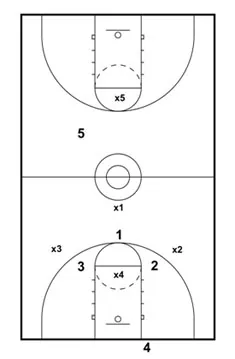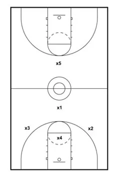 X4 lines up in the middle. X2 and X3 are on the side. X1 plays a centerfield-type role at half-court. X5 is the last line of defense.