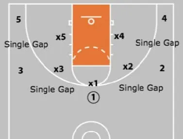 A single gap is when a defender is approximately one pass away. You will notice in a STATIC or STATIONARY 5-out motion, single gaps are everywhere.