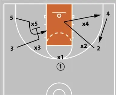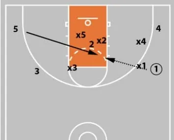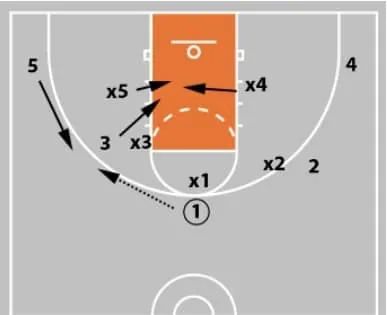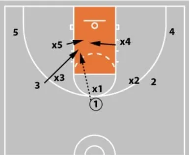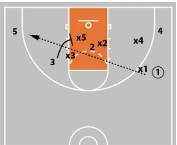 3 - The defensive rotation for x5 to help defend the basket cut is much easier diagrammed than executed.