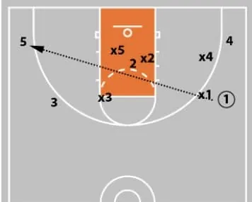 The offensive player 5 will be cutting towards the wing at the same time that 3 cuts to the basket. So if the x5 defender slides over too much to help, 5 will get open perimeter jump shots the whole game.