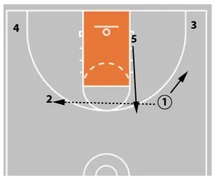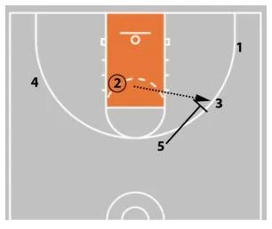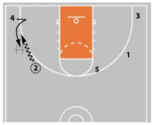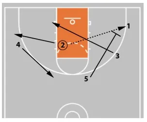 Not pictured here is player 2's roll after the handoff. They should roll to the front of the rim. If the ball is passed to 5, 5 can look for a hi-lo pass to 2.