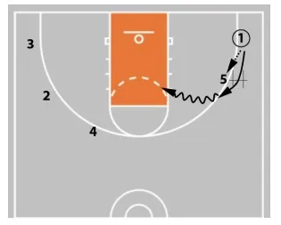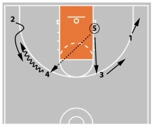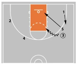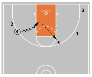 If the defense collapses and prevents 4 from getting to the rim, they can pass it out to player 5.