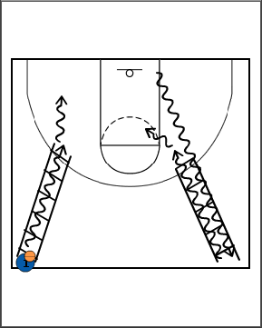 The purpose of the drill is to work on moving your feet quickly in tight spaces while incorporating finishes or jump shots.