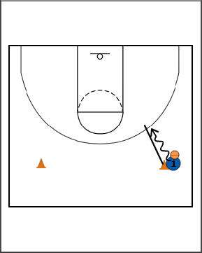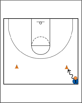 - Player 1 continues to the 3 point line with the cone/mb in opposite hand from the ball and puts it down.