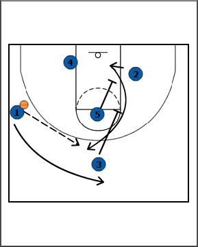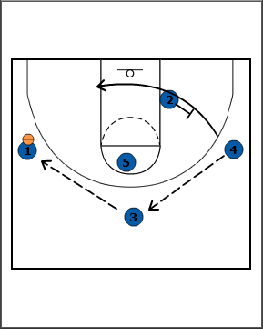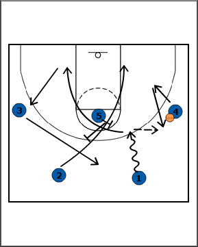 - 1 will pass then use screen from 5 and basket cut looking for a lob from 4 scoring opportunity 2