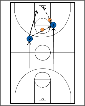 - Player 2 practices dribbling on the move, while Player 1 gets to about the free throw line (on the right side of it)