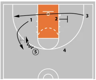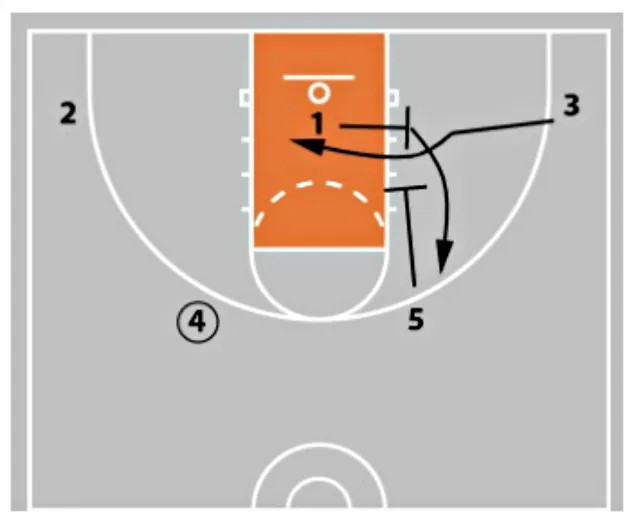 1 comes off the screen as 2 sets the back screen on 5’s defender.