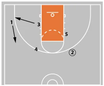 On the pass to 1 from 5, 3 now sets a back screen for 5 as 2 lifts up to the wing area.