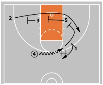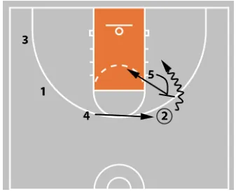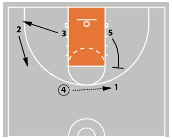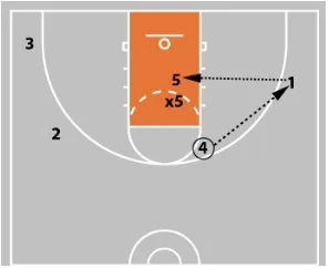 With the ball in 4’s hands, 3 cuts off 5’s screen as 1 slides down toward the wing area.