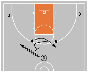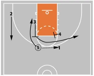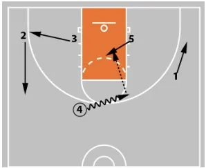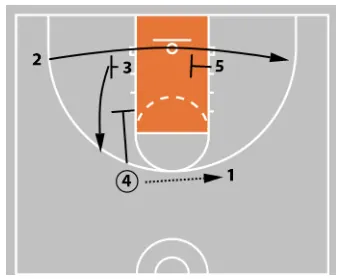 4 curls behind. This either removes 4’s defender as a help defender or leaves 4 wide open for a perimeter shot.