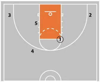 To balance the floor and create spacing, 2 and 3 move to spot up areas on the floor as the 2 man game occurs with 1 and 5.