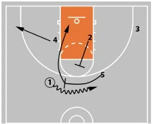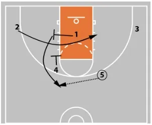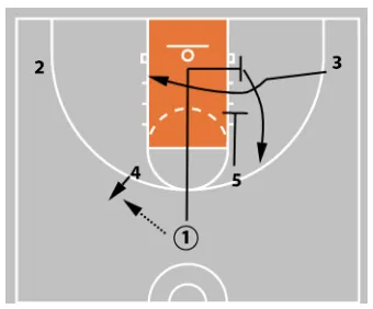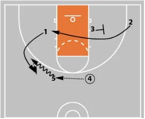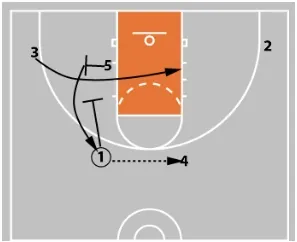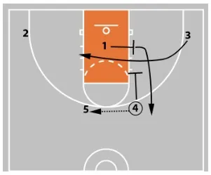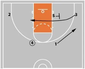 3 then cuts across the lane. At the same time, 5 sets a down screen for 1.