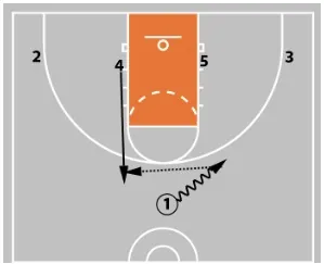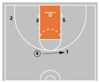 If 5’s defender is able to get above them to prevent the post entry pass, 4 now looks to pass the ball to 1, who now has a better passing angle into the post.