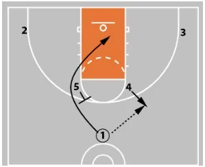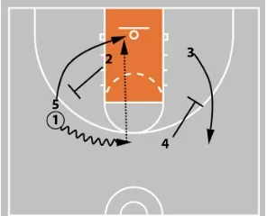 1 cuts off 5’s screen to the rim for a possible layup if open.
