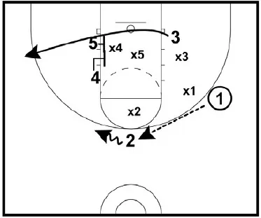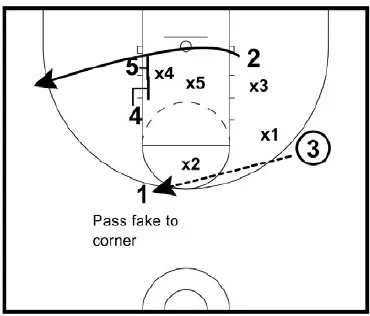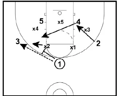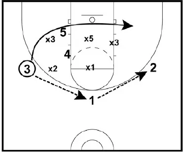 • 4 and 5 set a double screen. 3 cuts off the double screen looking for the shot on the wing. 1 can pass fake to 3 to draw the defender.