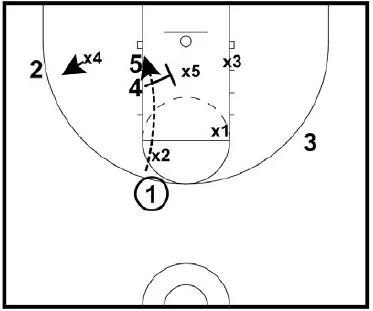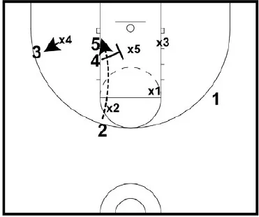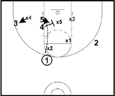• After 4 clears the center defender, 5 should be wide open for a lay up. If the bottom defender does not guard 5, then 3 will be open for a three point shot. It's important for 1 to read the defense and make the appropriate pass. Either 3 or 5 will be wide open.