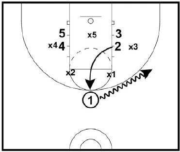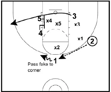 • 1 passes to 3. If the entry is not open, 1 can dribble at 3 for a shallow cut. Or 3 can v-cut to get open.