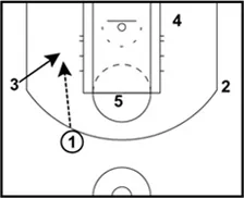 1 makes the pass to 3 on the left block. 3 tries to post up as close as possible to the basket.