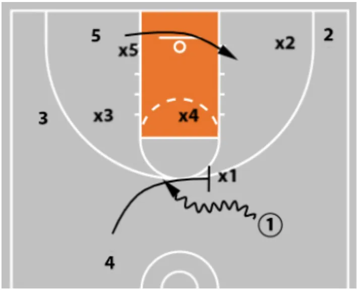 • The 5-man is going to go to the opposite side of the court when/if the point guard crosses the imaginary rim line at the top of the key.