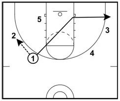 After player 1 cuts to opposite corner, player 5 goes to set a back screen for player 4, who cuts to the ball-side block.