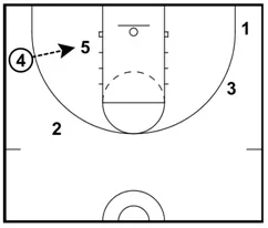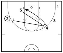 As player 5 is setting a ball-screen for player 2, player 4 cuts out to the near corner.