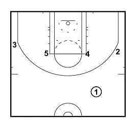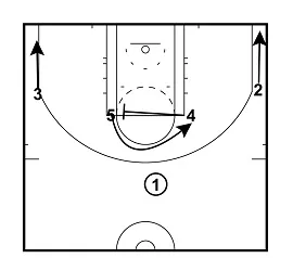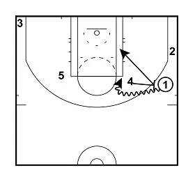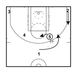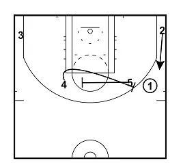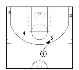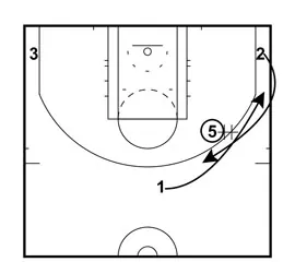 If Player 5 is unable to hand the ball off to Player 1. Player 1 will cut down towards the baseline and Player 2 will cut up towards the ball and take the hand off.