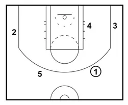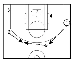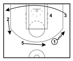 1 dribbles to the strong side wing. 3 runs to the opposite corner. 2 shifts to 5's previous spot. 5 moves to 1's previous spot.
