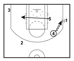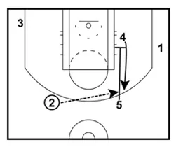 Note: a wrinkle is to have 4 set a back screen for 5. Run it if the defense expects the down screen. 2 can also cut to the basket for a give-and-go.
