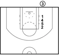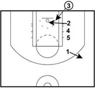 Note: 2 is the designated shooter on this play. It is crucial that 2 is a right-handed shooter. Otherwise, it will be an awkward catch-and-shoot from the right corner. If the play is run from the left side, the opposite applies.