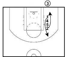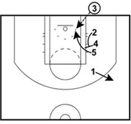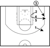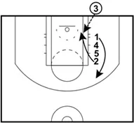 1 releases to the perimeter. 2 cuts towards the basket preparing to rub off a double screen from 4 and 5.