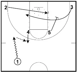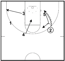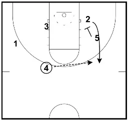 If 5 rolls to the basket, 4 fills behind 2 for a drive and kick.