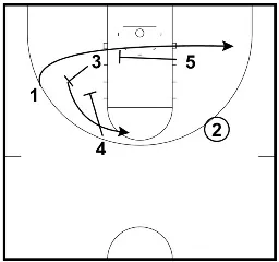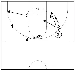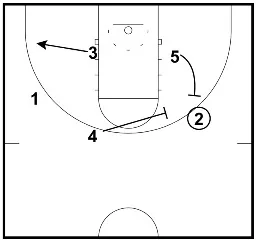 As the pass is thrown, 2 clears to the opposite block. 5 sets a screen for 3 who cuts to the ballside block.