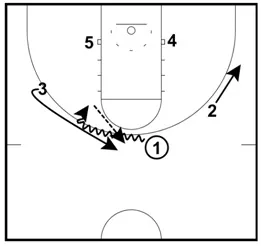 The 3 man cuts right off the 1, using his teammate as a screen, immediately looking for his shot.