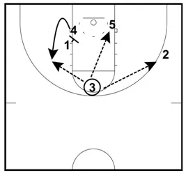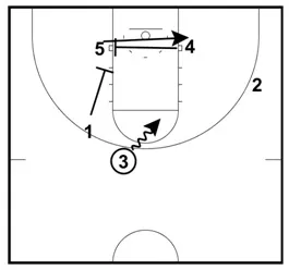 At the same time, the 1 will down screen for the 4 who will curl up to the elbow once he has set the screen for the 5.