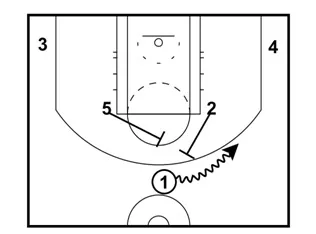 If 2 is not open, 5 sets a ball-screen for 1. 1 should have enough space to attack since the defense will tightly guard 2.