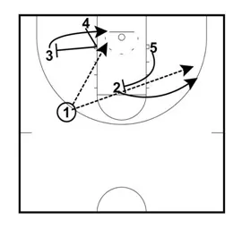 This creates two options for the 1 man. He can look to pass to the 3 man at the basket or the 2 at the three point line.