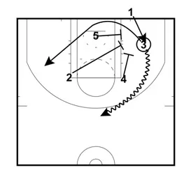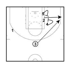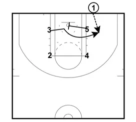 - Player #3 will then set a screen for Player #5. Player #5 crosses the lane and is looking for a pass from Player #2.