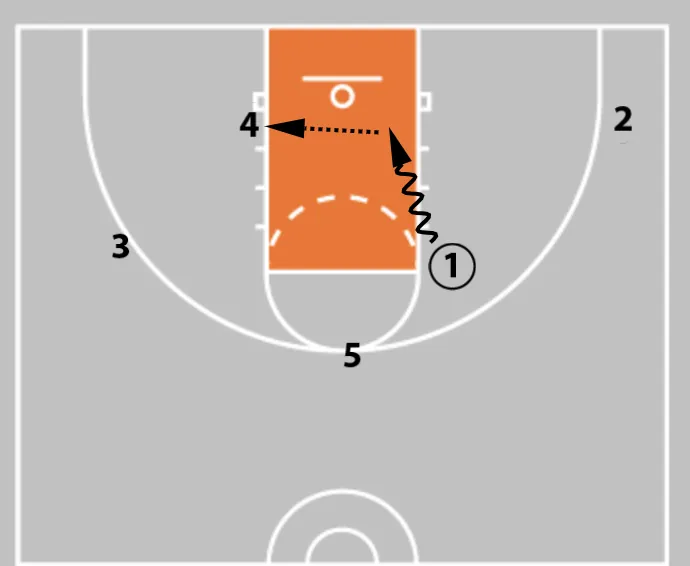 2. If Player 4's defender slides over to help, Player 1 passes to Player 4 for a scoring opportunity.