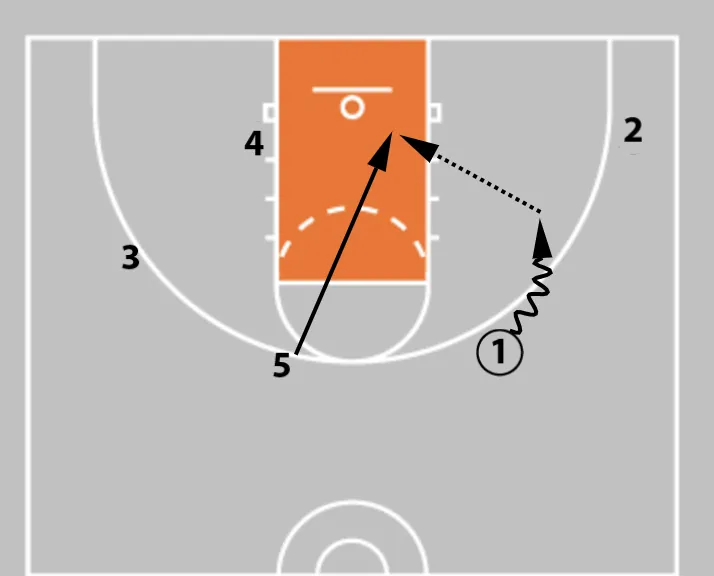 1. If the defense forces Player 1 wide, Player 5 rolls to the basket to execute the pick and roll.