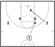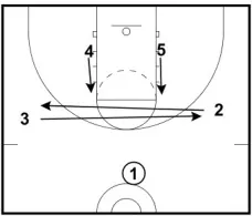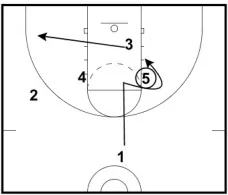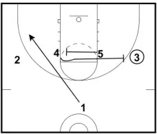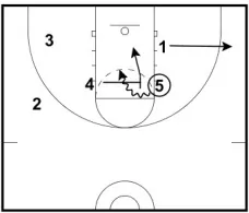 1. After the pass, 1 cuts to the corner. 5 screens 4, and 4 immediately sets a ball screen for 3. (Note: The screen between 4 and 5 makes it more difficult to cover the ball screen.)