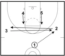 2. To initiate the play, 2 and 3 cross. As soon as 2 and 3 cross, 4 and 5 cut to the high post.
