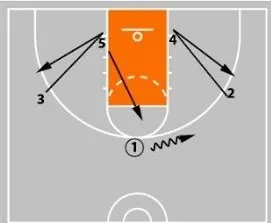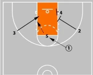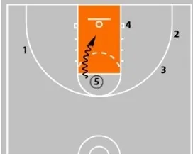Tip: The driving lane for the 5 will be to the side opposite of where the 4 is located. A quick head and shoulder fake to the left, before a spin to the right, will usually result in the 5 getting to the rim.