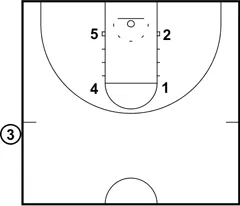 The play begins with 3 taking the ball out of bounds. 5 starts on the left low block. 2 starts on the right low block. 4 starts on the left elbow and 1 starts on the right elbow.