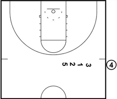 The play begins with 4 taking the ball out of bounds. 3, 1, 2 and 5 start across from the ball, lined up in a stack formation.