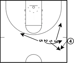After 4 passes the ball to 1, he and 2 set a down screen for 3 who cuts from the right wing to the middle of the lane.