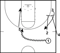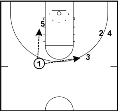 If 1 does not have a pass to 5, his next option is to look for 3 who has used a double screen to get open on the right side.
