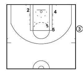 1 passes to 2 for a three-point shot at the top of the key.