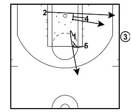 4 sets a down screen for 2, who takes a few steps toward the basket like he is going backdoor.
