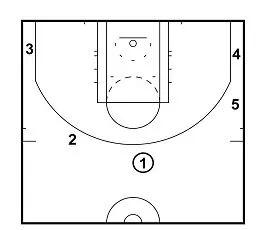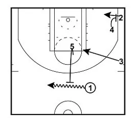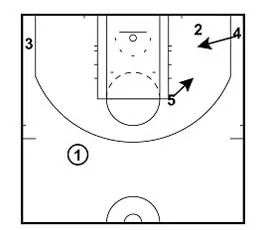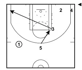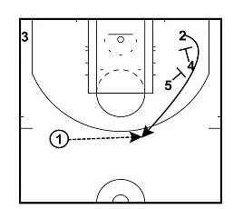 5 sets a screen for 1. 1 cuts to the top of the arc to receive the ball from 3.