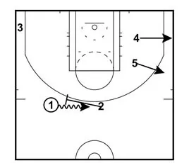 If 2 doesn't receive the pass from 1, he goes to set a ball screen for 1. 1 then dribbles across court to keep the floor balanced.